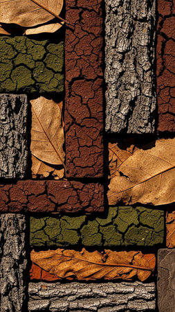 An organic mosaic of natural like tree bark, cracked earth, and dried leaves arranged in a geometric pattern with rich earthy colors.