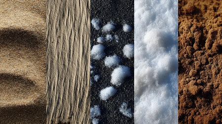 High-resolution vertical collage displaying four distinct natural textures: desert sand dunes, cracked ice, polished marble veins, and rugged tree bark close-up.