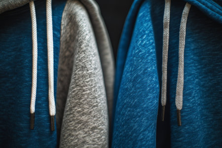 Two hoodies in blue and gray colors are displayed on wooden hangers inside a trendy clothing store, emphasizing modern casual wear and urban fashion style.