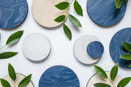 Blue and white wooden circles are arranged with green leaves, creating a stylish, contemporary design on a white background.