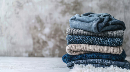 Stylish sweaters on blue background, closeup