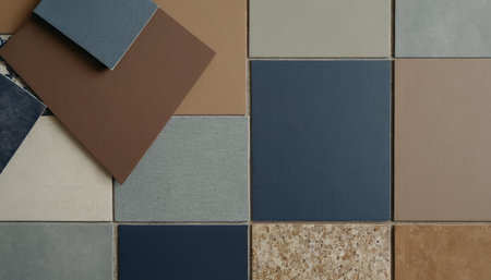 Collage of different types of tiles. Top view. Flat lay.