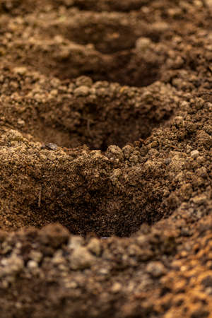 Eco friendly gardening. Holes in the soil prepared for planting, fertilized with compressed chicken manure pellets.