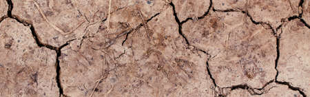 Natural dirty mud ground texture background. Closeup macro of dry brown soil sand land. Abstract earth nature backdrop or wallpaper. Web banner header.