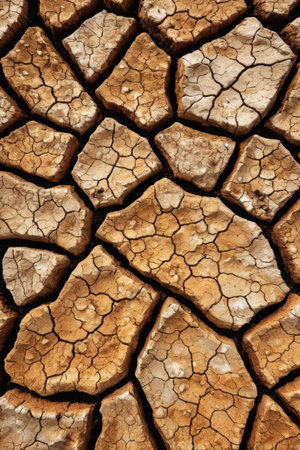 The image showcases a close-up view of dry, cracked earth, revealing intricate patterns and textures that tell a story of drought and resilience. The warm, earthy tones evoke a sense of arid beauty, highlighting the struggle of nature in harsh conditions.