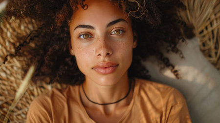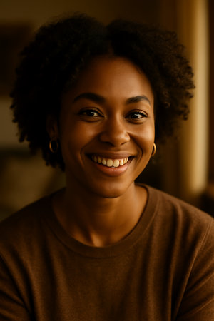 Woman smiling gently indoors under warm lighting.