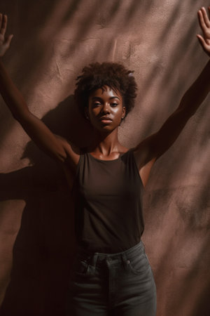 Photo of surprised Afro woman in black t shirt gasps from amazement looks with scared face expression aside dressed in black t shirt unexpected to see something horrible : Generative AI