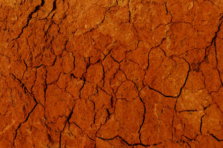 Top view cracked red soil. Picture of natural disaster. Drought land, global warming and deforestation. Image of brown soil texture, close up.