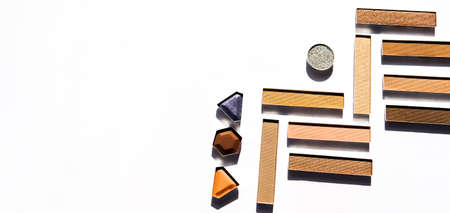 Materials Concept. Top view of wood laminate materials on wooden floor. Interior materials design for home and renovation building. Surface Color Texture of laminate, veneer, parquet, plywood and vinyl floor for Interior designer. Wallpaper for furniture background.