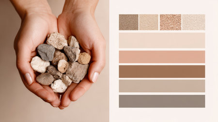 Hands gently cradle assorted natural stones, reflecting a range of textures and colors, paired with a color palette of earthy hues.
