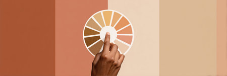 A hand points to a color wheel while various warm tones are displayed on the wall, showcasing options for a stylish interior design project.
