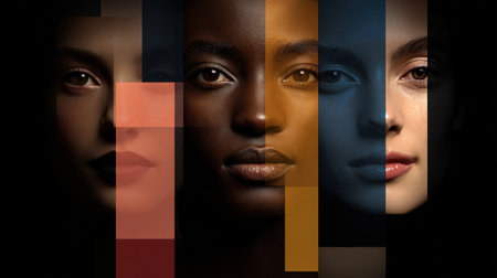 Four unique faces are presented in a modern art display, showing the beauty of diversity with strong color contrasts and geometric shapes in a dark setting.