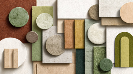 Paper showing stacks of square paper samples in muted pastel and earthy tones arranged in a grid pattern on a...