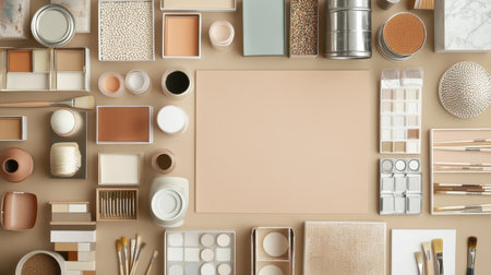Discover an aesthetically pleasing flatlay featuring an array of beauty and makeup products artistically arranged on a smooth, neutral surface, ideal for creative inspiration.