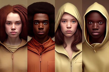 Group of young African American adults in beige attire standing against neutral background, AI generated
