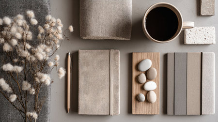 Stylish neutral-toned workspace, notebooks and coffee, natural textures, calm and modern atmosphere