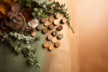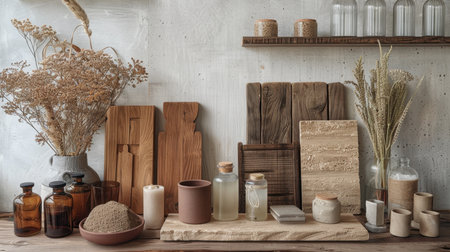 A creative flat lay of earthy tones featuring natural materials like stones, dried flowers, and textured tiles. Ideal for themes of nature, texture, and rustic design.