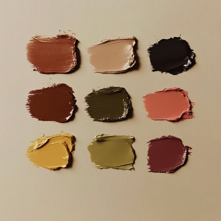 Colorful artist palette featuring a variety of neutral and earthy tones arranged neatly on a textured white surface