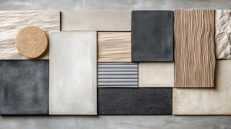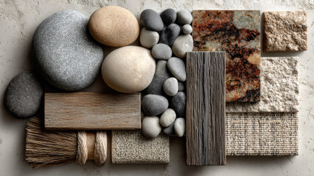 A captivating arrangement of diverse textures showcasing smooth stones, rustic wood, and natural fabrics, ideal for design projects and decor ideas.