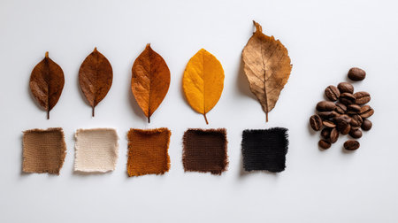 Top-down view showcases five dried leaves arranged in a horizontal line above five corresponding square fabric swatches, creating a color gradient from light brown to dark brown and black, with a small pile of roasted coffee beans situated to the right, all positioned on a plain white surface.