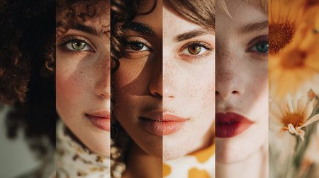 A composite portrait featuring mug shots of serious young women from diverse ethnicities, races, and geographical backgrounds worldwide