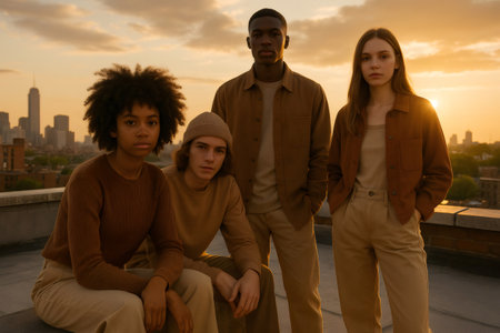 Four young fashion models posing on a rooftop at sunset with the city skyline in the background