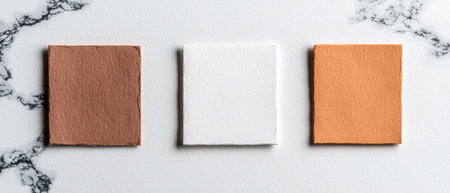 Three textured squares of paper in brown, white, and orange shades on a marble background