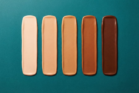 Five foundation swatches showing diverse skin tones from fair to deep applied in smooth lines for beauty product range demonstration and inclusive makeup shade selection