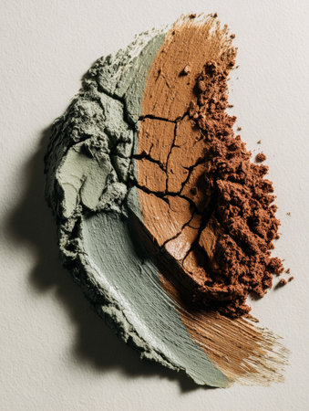Earthen clay mask shows intricate cracking patterns on the skin, showcasing natural colors and textures in a clean, serene environment.