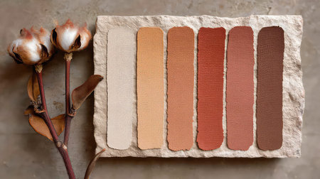 This image features a stunning array of earthy color palette samples on a textured surface, accompanied by beautiful cotton blooms, perfect for design projects.