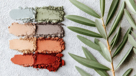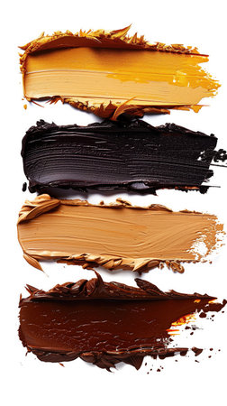 This image presents a vertical arrangement of various makeup shades on a white surface. The colors range from light beige to dark brown, with green and orange accents. The composition showcases a smooth texture and detailed brushstrokes. This image could be used for beauty product promotion and design materials.