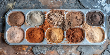 A visually striking arrangement of powdered ingredients showcases a palette of natural colors, perfect for culinary creativity and artistic inspiration in food photography.