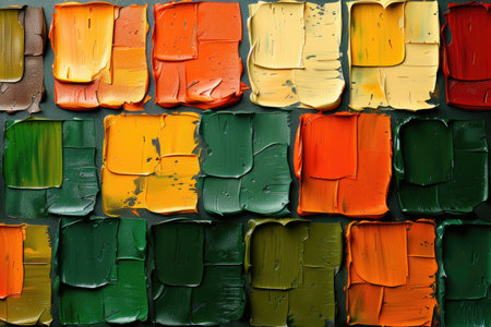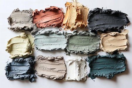 Smooth lines of paint swatches display earthy tones. Each color has a different texture, highlighting shades ranging from warm oranges to muted greens, ideal for decor.