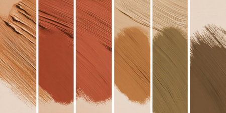 Mosaic arrangement of skin toned concealer or foundation smudges in beige green brown and neutral shades displayed on neutral surface illustrating diverse color options for makeup coverage and blending