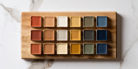 A collection of paint colors displayed on a wooden board. The palette features various shades, arranged neatly for easy selection during artistic projects.