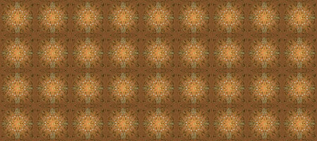 Ornamental lace tracery. Raster seamless pattern with floral ornament. Golden ornate illustration for wallpaper. Vintage design element in Eastern style. Traditional decor on orange and brown colors.