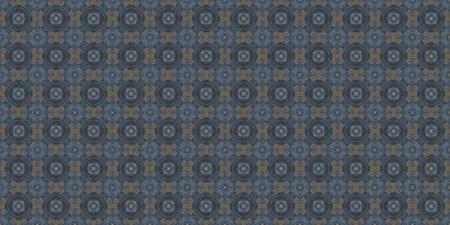 Floral showing intricate and detailed symmetrical geometric pattern with repeating floral motifs in shades of blue, gold, and brown creating a rich and ornate...