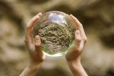 A close-up shot of a globe resting on the ground, surrounded by grass and rocks. The globe symbolizes our planet earth and the importance of protecting our environment. The image conveys a sense of hope and possibility for a sustainable future.
