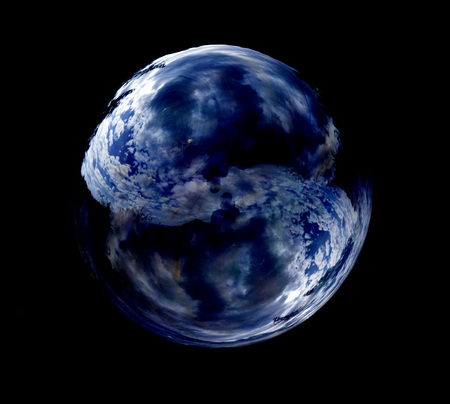 Clouds reflection in isolated soap bubble, black background.