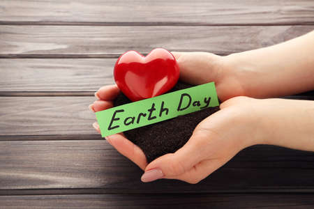 Female hands with soil, red heart and text Earth Day on wooden background