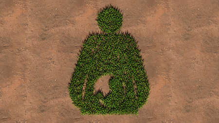 Concept conceptual green summer lawn grass symbol shape on brown soil or earth background, pregnant woman sign. 3d illustration metaphor for motherhood, maternity, awaiting, love, care, life and joy