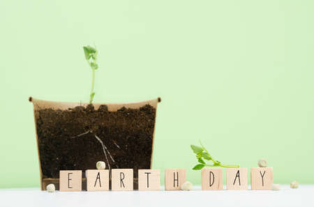 Young seedling peas in transparent pot, green sprout, seeds, wood cubes with lettering Earth day on white wood table, green wall. Save planet background.