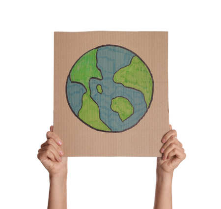 Protestor holding placard with drawing of Earth on white background, closeup. Climate strike
