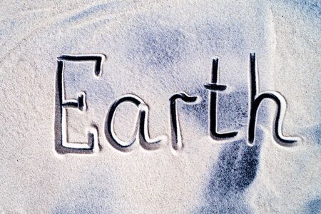 The inscription Earth is written in close up on sea sand.