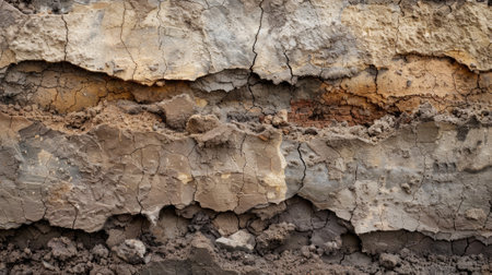 Rough and crumbling soil with layers of different shades of earth visible in intricate patterns