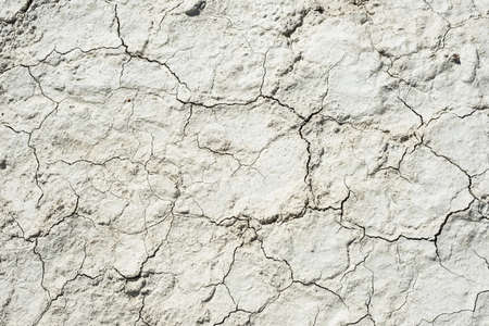 Nature background of dry stream bed on lifeless desert land. Natural texture of wadi. Clay surface of barren dryland wasteland close-up. Full frame to terrain with arid climate. Dry small river bed.