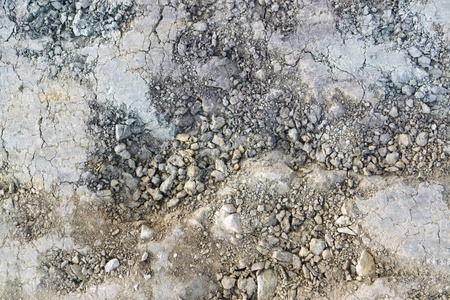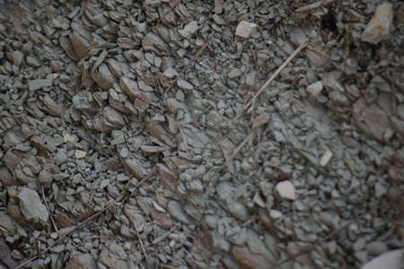 Close-up of ground with dirt and sand soil in random with small stones. Randomly sketched dirty loose coarse sand interspersed with debris and small gravel