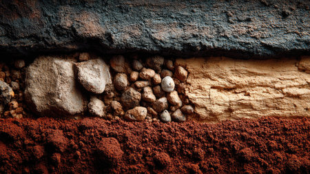 This image showcases a detailed cross-section of earth layers, illustrating various soil textures and colors ideal for geological studies and environmental education.