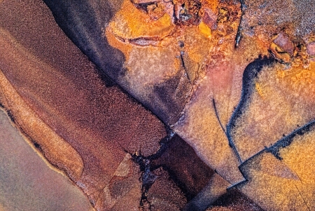 A tack-sharp abstract aerial view of natural landscapes, where the terrain forms intricate patterns and shapes, resembling a work of art, in high resolution.