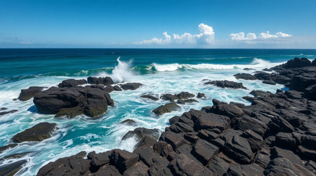 Turquoise sea waves slamming into jagged lava edges with cinematic force.